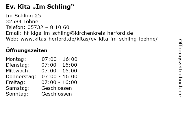 | Öffnungszeiten Ev. Kita „Im Schling“ in Löhne anzeigen | |