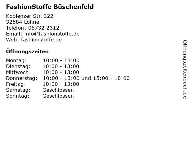 | Öffnungszeiten FashionStoffe Büschenfeld in Löhne anzeigen | |