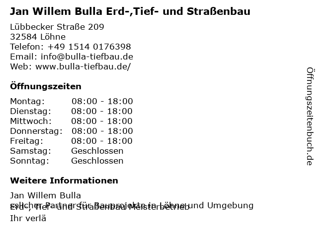 Branchen & Suchbegriffe zu Jan Willem Bulla Erd-,Tief- und Straßenbau:bulla, erd, jan, straßenbau, tief, willem |