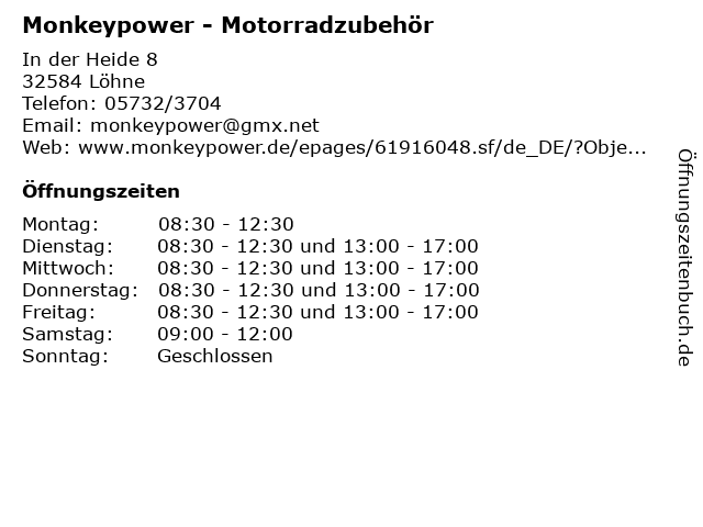 | Öffnungszeiten Monkeypower - Motorradzubehör in Löhne anzeigen | |