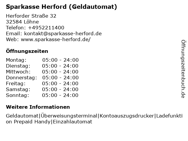 | Öffnungszeiten Sparkasse Herford (Geldautomat) in Löhne anzeigen | |