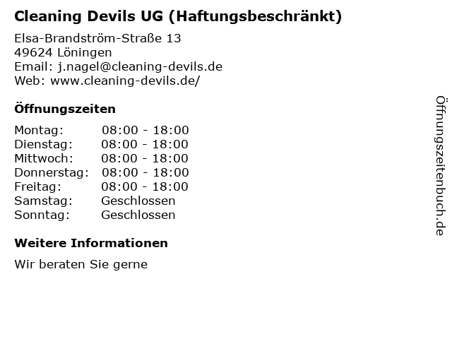 | Öffnungszeiten Cleaning Devils UG (Haftungsbeschränkt) in Löningen anzeigen | |