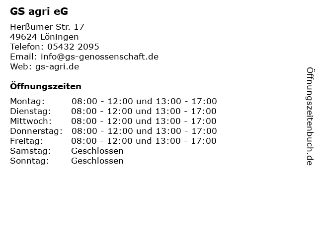 | Öffnungszeiten GS agri eG in Löningen anzeigen | |