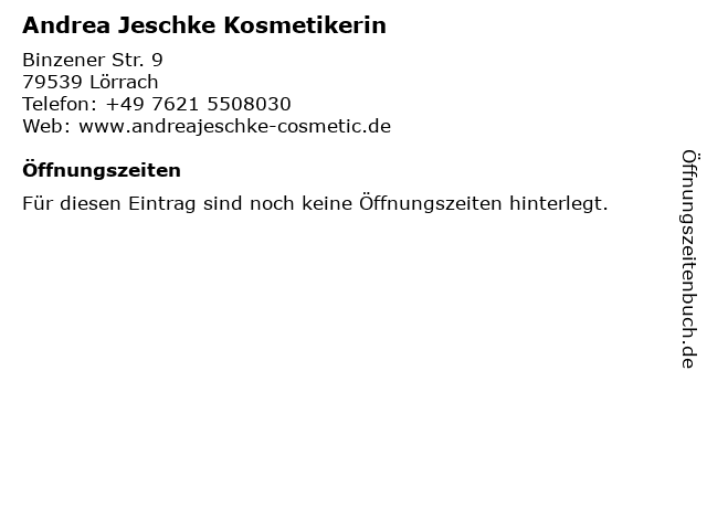 | Öffnungszeiten Andrea Jeschke Kosmetikerin in Lörrach anzeigen | |