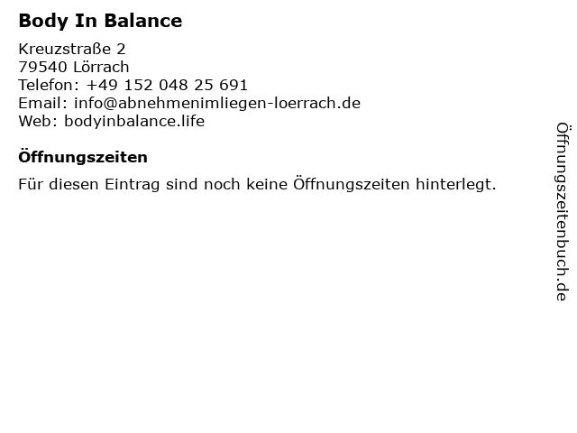 | Öffnungszeiten Body In Balance in Lörrach anzeigen | |