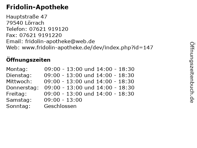 | Öffnungszeiten Fridolin-Apotheke in Lörrach anzeigen | |
