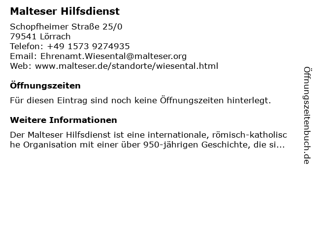 | Öffnungszeiten Malteser Hilfsdienst in Lörrach anzeigen | |