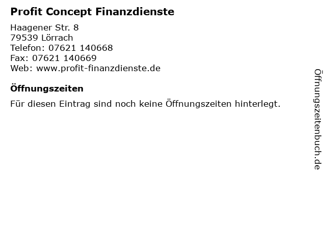 | Öffnungszeiten Profit Concept Finanzdienste in Lörrach anzeigen | |