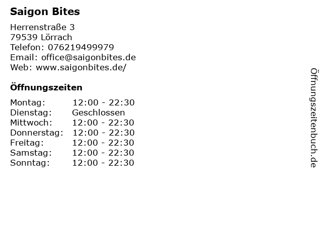 | Öffnungszeiten Saigon Bites in Lörrach anzeigen | |