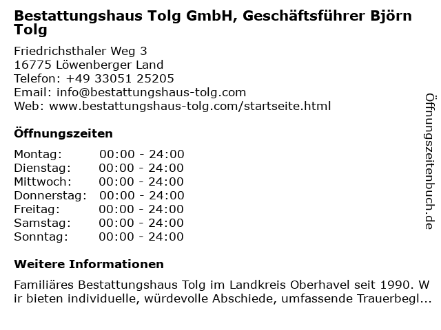 1 Bestattungshaus Tolg GmbH, Geschäftsführer Björn Tolg (Entfernung: 6,35 km) Bernauer Straße 92, 16515 Oranienburg 2 Bestattungshaus Tolg GmbH, Geschäftsführer Björn Tolg (Entfernung: 12,11 km) Ahornstraße 13, 16766 Kremmen 3 Bestattungshaus Günter Tolg Inh. Torsten Tolg (Entfernung: 0,05 km) Friedrichsthaler Weg 3, 16775 Löwenberger Land 4 Bestattungshaus Becker in Velten Hennigsdorf und Oranienburg (Entfernung: 5,50 km) Sachsenhausener Str. 23a, 16515 Oranienburg 6 |