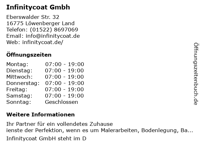 | Öffnungszeiten Infinitycoat Gmbh in Löwenberger Land anzeigen | |