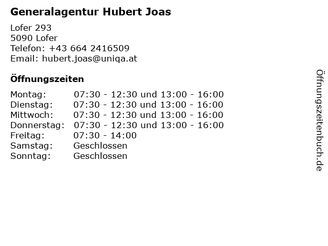 | Öffnungszeiten Generalagentur Hubert Joas in Lofer anzeigen | |