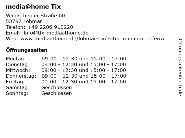 | Öffnungszeiten media@home Tix in Lohmar anzeigen | |