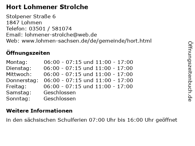 | Öffnungszeiten Hort Lohmener Strolche in Lohmen anzeigen | |