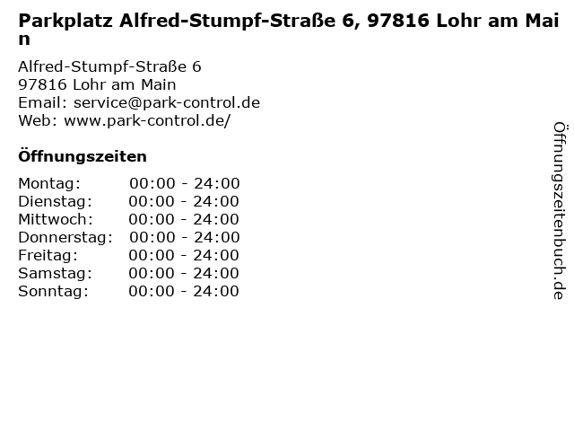 | Öffnungszeiten Parkplatz Alfred-Stumpf-Straße 6, 97816 Lohr am Main in Lohr am Main anzeigen | |