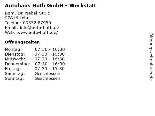 | Öffnungszeiten Autohaus Huth GmbH - Werkstatt in Lohr anzeigen | |