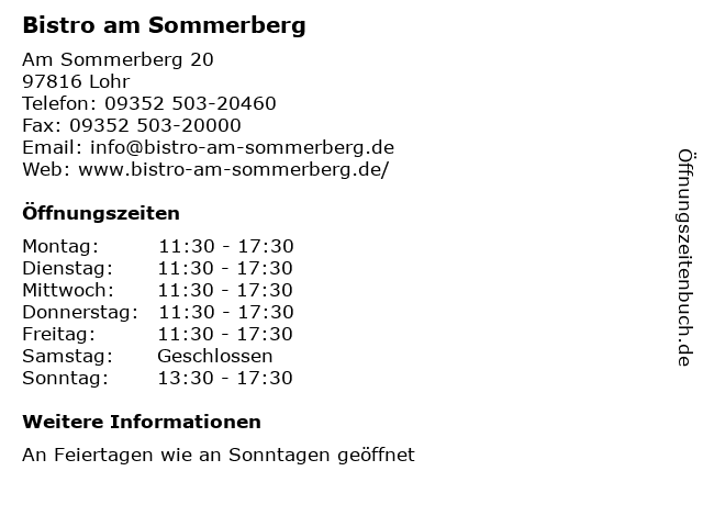 | Öffnungszeiten Bistro am Sommerberg in Lohr anzeigen | |