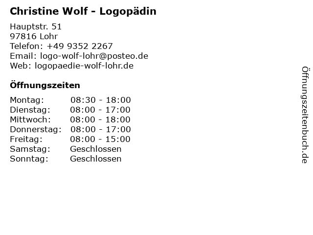 | Öffnungszeiten Christine Wolf - Logopädin in Lohr anzeigen | |