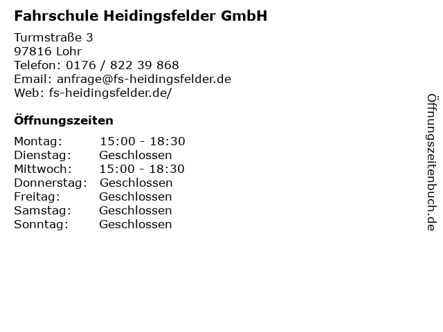 | Öffnungszeiten Fahrschule Heidingsfelder GmbH in Lohr anzeigen | |