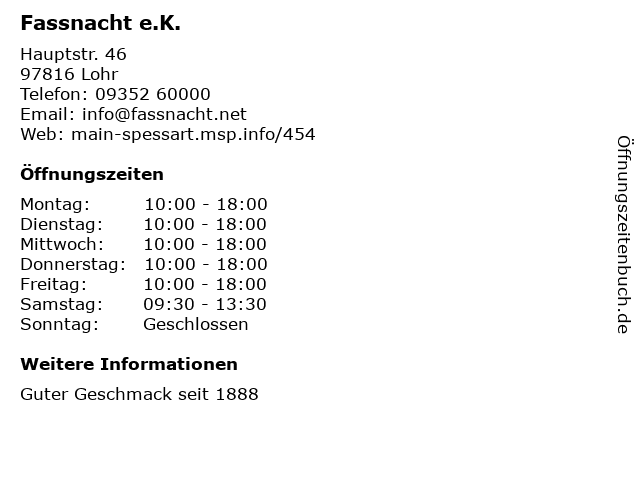 | Öffnungszeiten Fassnacht e.K. in Lohr anzeigen | |