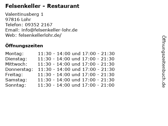 | Öffnungszeiten Felsenkeller - Restaurant in Lohr anzeigen | |