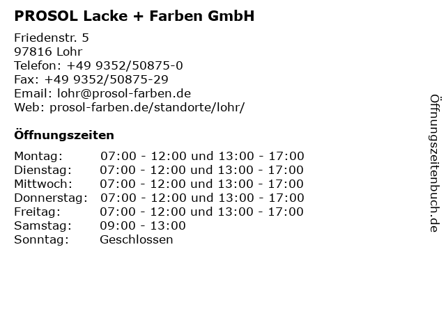 | Öffnungszeiten PROSOL Lacke + Farben GmbH in Lohr anzeigen | |