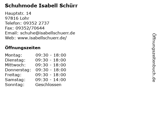 | Öffnungszeiten Schuhmode Isabell Schürr in Lohr anzeigen | |