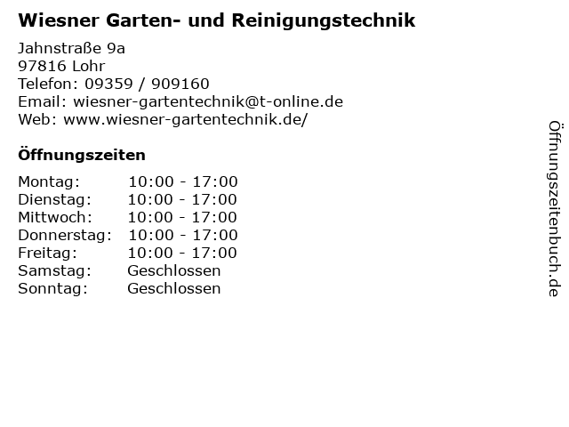| 1 Wiesner Garten- und Reinigungstechnik (Entfernung: 7,41 km) Raiffeisenstr. 4, 97854 Steinfeld bei Lohr am Main 6 |