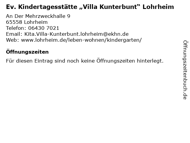 | Ev. Kindertagesstätte „Villa Kunterbunt“ Lohrheim anrufen | |