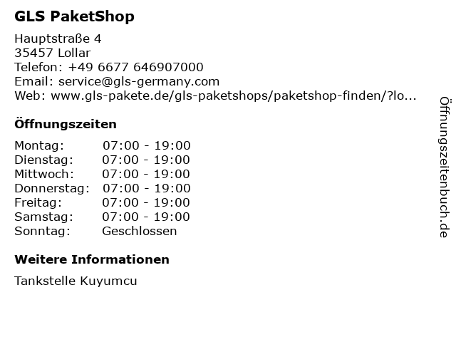 | Öffnungszeiten GLS PaketShop in Lollar anzeigen | |