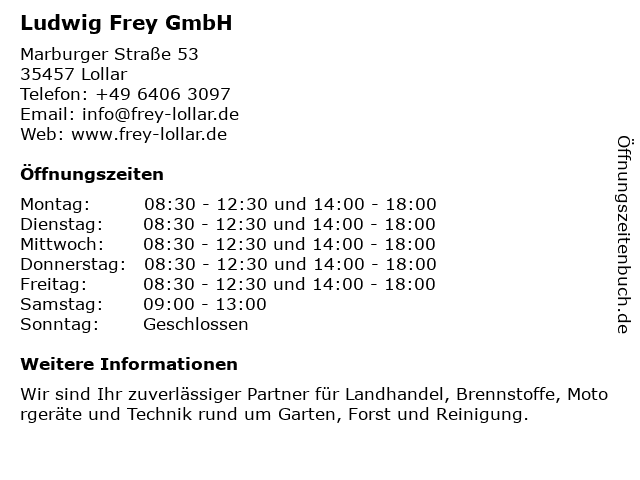 | Öffnungszeiten Ludwig Frey GmbH in Lollar anzeigen | |