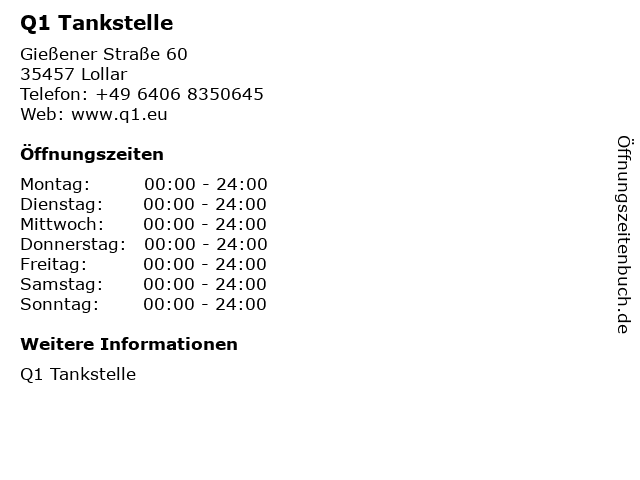 | Öffnungszeiten Q1 Tankstelle in Lollar anzeigen | |