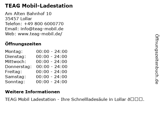 | Öffnungszeiten TEAG Mobil-Ladestation in Lollar anzeigen | |