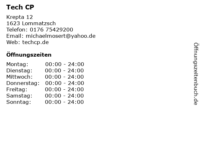 | Öffnungszeiten Tech CP in Lommatzsch anzeigen | |