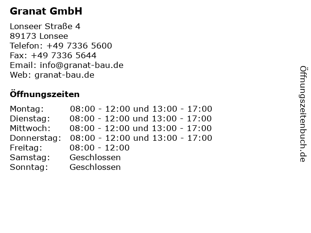 | Öffnungszeiten Granat GmbH in Lonsee anzeigen | |