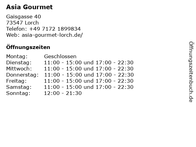 | Öffnungszeiten Asia Gourmet in Lorch anzeigen | |