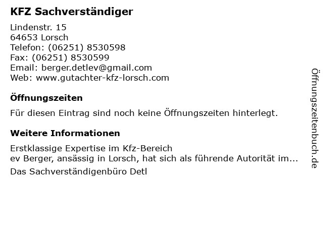 | Öffnungszeiten KFZ Sachverständiger in Lorsch anzeigen | |