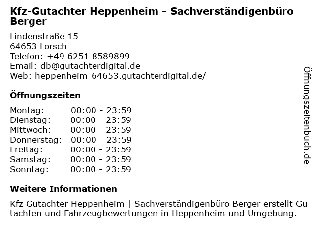 1 Sachverständigenbüro Energie-und Bauberatung Lorsch (Entfernung: 1,18 km) Hirschstr. 40, 64653 Lorsch 2 Kfz-Gutachter Bensheim - Sachverständigenbüro Michael Hansen (Entfernung: 3,49 km) Berliner Ring 15, 64625 Bensheim 5 Kfz-Sachverständigenbüro Michael Koch GmbH (Entfernung: 8,51 km) Gartenstr. 7, 64665 Alsbach-Hähnlein 6 |