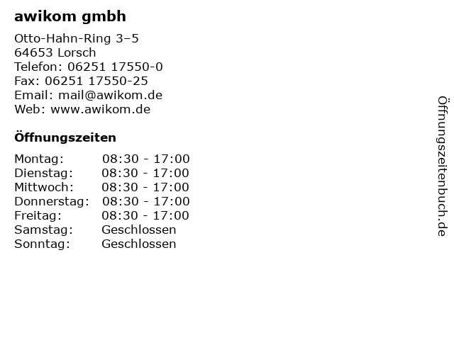 | Öffnungszeiten awikom gmbh in Lorsch anzeigen | |
