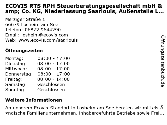 Branchen & Suchbegriffe zu ECOVIS RTS RPH Steuerberatungsgesellschaft mbH & Co. KG, Niederlassung Saarlouis, Außenstelle Losheim:außenstelle, ecovis, mbh, niederlassung, rph, rts, steuerberatungsgesellschaft |