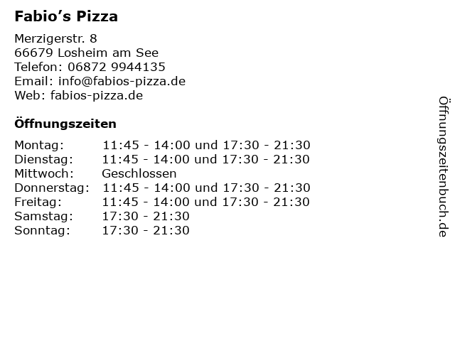 | Öffnungszeiten Fabio’s Pizza in Losheim am See anzeigen | |