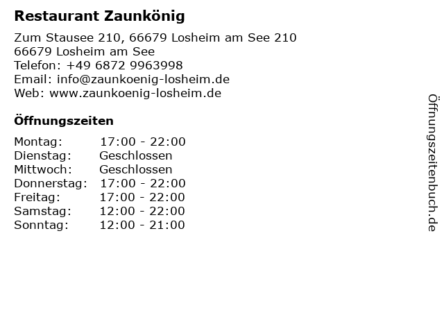 | Öffnungszeiten Restaurant Zaunkönig in Losheim am See anzeigen | |