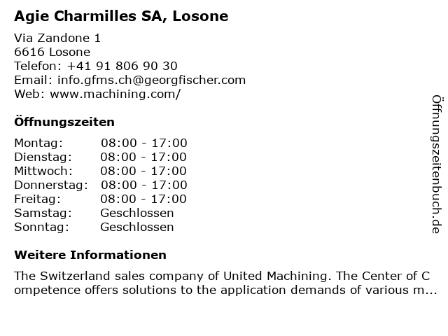 | Öffnungszeiten Agie Charmilles SA, Losone in Losone anzeigen | |