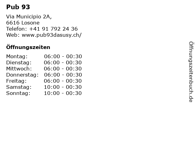| Öffnungszeiten Pub 93 in Losone anzeigen | |