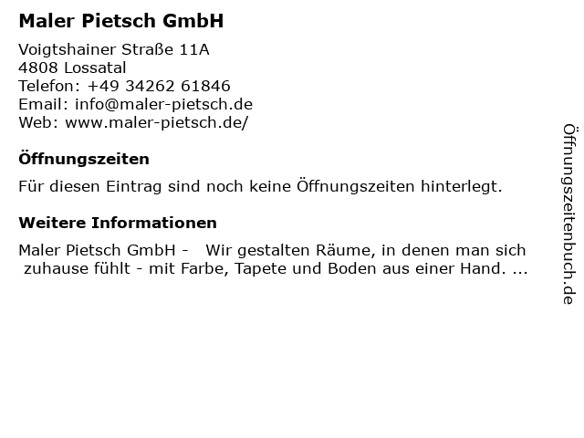 | Öffnungszeiten Maler Pietsch GmbH in Lossatal anzeigen | |