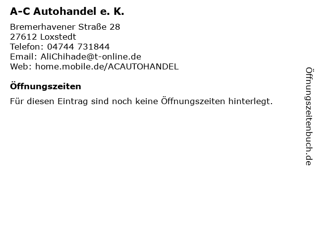 | Öffnungszeiten A-C Autohandel e. K. in Loxstedt anzeigen | |