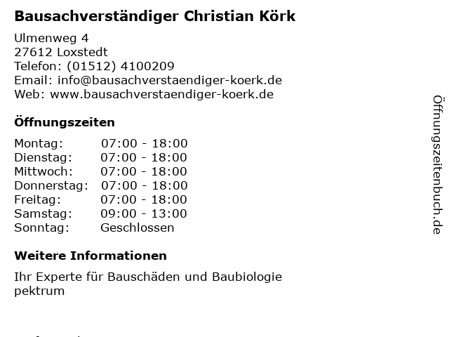 1 Dachdeckermeister Alexander Laverentz-Körk (Entfernung: 0,96 km) Wiemsdorfer Dorfstraße 39, 27612 Loxstedt 6 GTÜ-Kfz-Prüfzentrum Oldenburg Inh. Dipl. Ing. (FH) Ahmad Ghalkhani (Entfernung: 34,54 km) Felix-Wankel-Str. 3, 26125 Oldenburg |