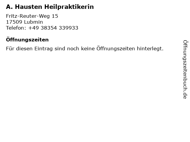 | Telefonnummer A. Hausten Heilpraktikerin in Lubmin (+49 38354 339933) anrufen | |