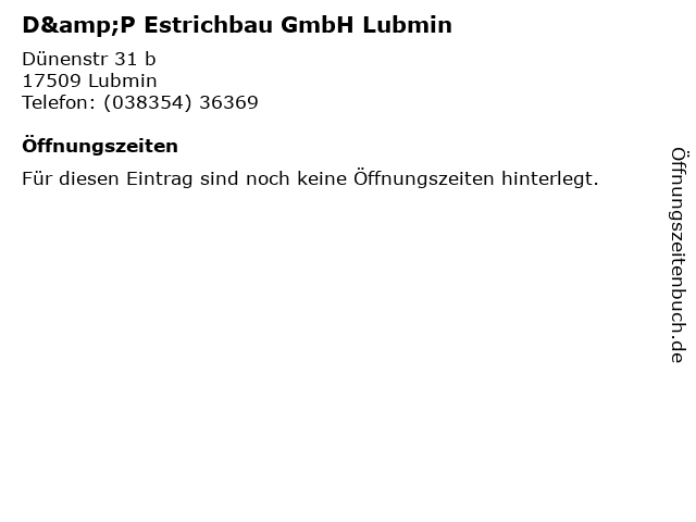 | Öffnungszeiten D&P Estrichbau GmbH Lubmin in Lubmin anzeigen | |