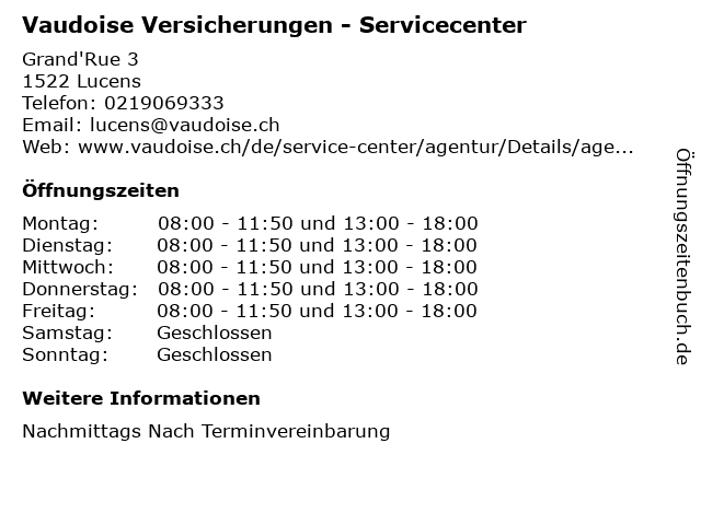 3 BCV, Banque Cantonale Vaudoise (Finanzberatung / Conseils financiers) (Entfernung: 0,11 km) Avenue de la Gare 4 a, 1522 Lucens 4 BVC, Banque Cantonale Vaudoise (Geldautomat / ATM / Bancomat) (Entfernung: 0,11 km) Avenue de la Gare 4a, 1522 Lucens 5 BVC, Banque Cantonale Vaudoise (Fonds / Caisse) (Entfernung: 0,11 km) Avenue de la Gare 4A, 1522 Lucens 6 |